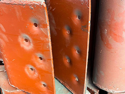 提升机料斗也是由侧板和主体结构焊接而成的,侧板的制造形式如图所示,侧板上有四个凸台,每一个凸台上有孔,其位置十分重要,对*确度要求也是,因为孔的制造影响到后续的安装和焊接,在后续的安装中四个孔不仅要与板链相连接,而且其精确度的降低会使安装后料斗歪斜或使板链受力不均。在制造料斗的时候一般采用的步骤是:下料后,将制造好的模具安在冲床上进行冲压落料,在专门卡具上焊接凸台,在专门卡具上钻四个凸台上的孔,以其位置精确。料斗的侧板制造完成后,对于料斗主体的制造中要进行弯曲加工,需要使用胎具,在压力机上进行,主体和侧板制造完成之后就可以进行焊接,整个料斗制造完成。