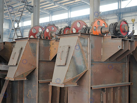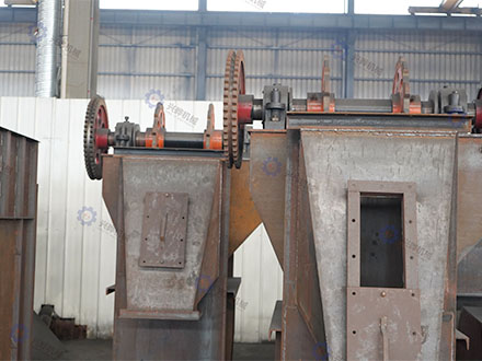 斗式提升机的牵引构件有环链、板链和胶带等几种。环链的结构和制造比较简单,与料斗的连接也很牢固,输送磨琢性大的物料时,链条的磨损较小,但其自重较大。板链结构比较牢固,自重较轻,适用于提升量大的提升机,但铰接接头易被磨损,胶带的结构比较简单,但不适宜输送磨琢性大的物料,普通胶带物料温度不超过60°C,夹钢绳胶带允许物料温度达80°C,耐热胶带允许物料温度达120°C,环链、板链输送物料的温度可达250°C。