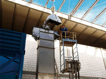 斗式提升机是利用均匀固接于无端牵引构件上的一系列料斗,竖向提升物料的连续输送机械,斗式提升机利用一系列固接在牵引链或胶带上的料斗在竖直或接近竖直方向内向上运送散料 。分为环链、板链和皮带三种。